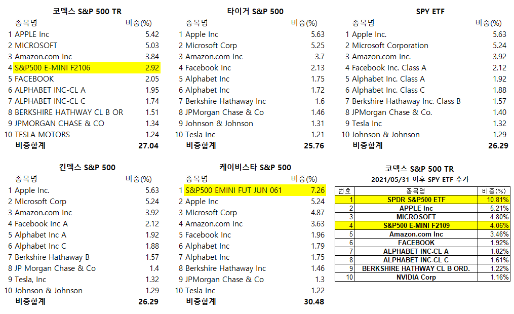 | 구성종목수 | 505종목 - 지수방법론에 따라 500종목을 편입하게 되어 있으나, 기초지수 구성종목 중 class 분할 종목이 포함됨 |