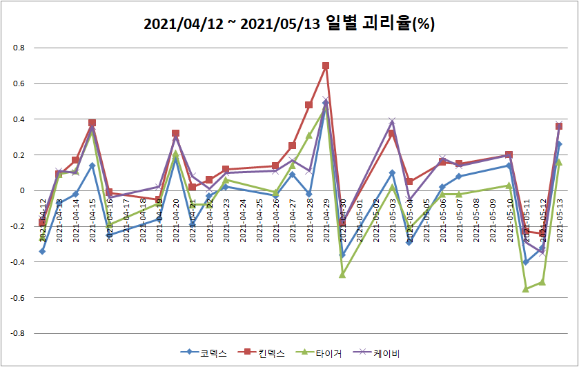 약 한달간의 일별 괴리율 비교표 입니다. 개인적으로 큰 차이는 없는 것 같습니다.
