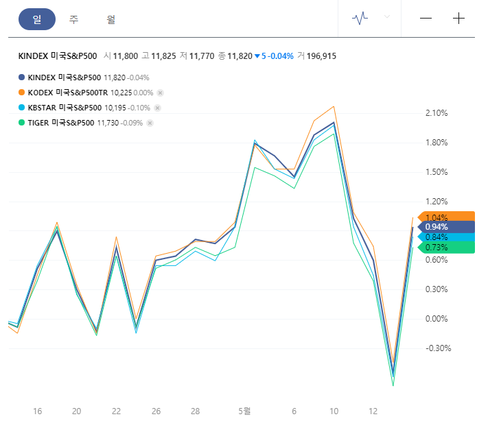 | KODEX 미국S&P 500TR | KBSTAR 미국S&P 500 | TIGER 미국S&P 500 | KINDEX 미국S&P 500 | |