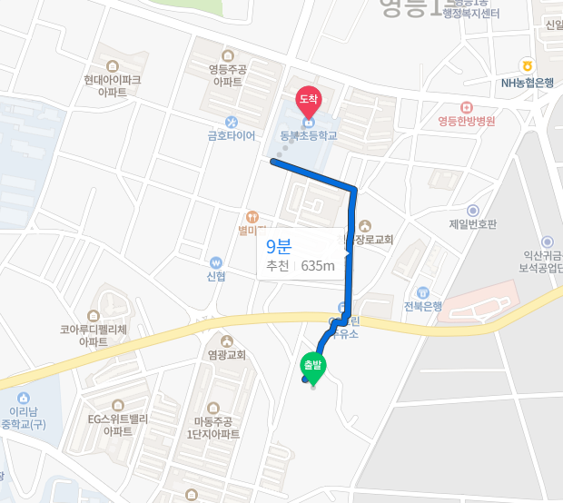 단지 구성에 따라 다르겠지만, 동북초등학교와 약 640m 정도 떨어져 있으며, 지도상 도보로 약 9분 저학년 초등학생 걸음으론 약 15정도 떨어진 거리로 부모님과 같이 통학하기에 무리가 없는 거리 입니다.