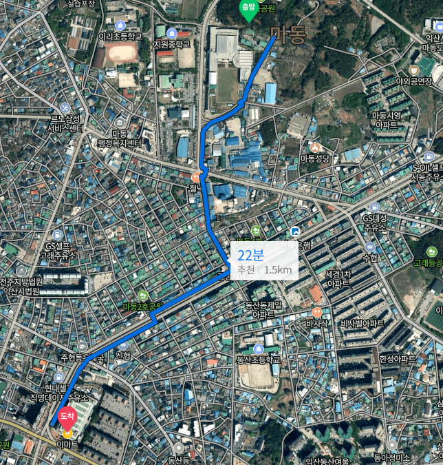 익산 이마트 까지는 지도상 약 1.5km 걸어서 25분 정도 소요됩니다.