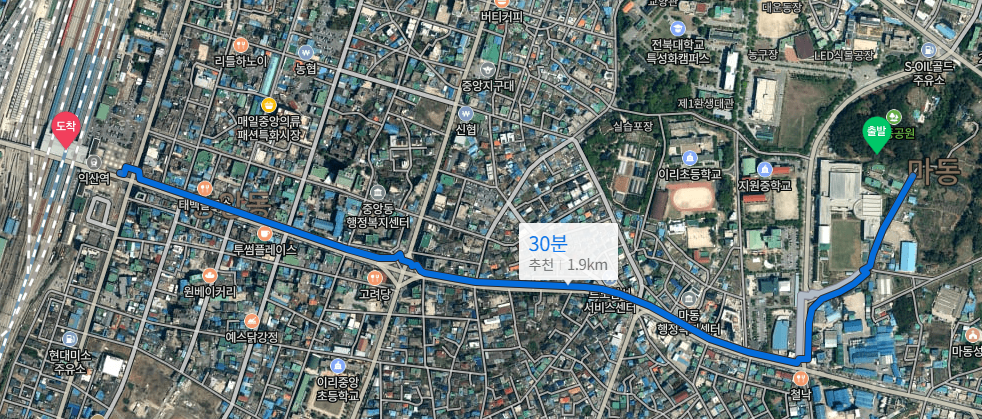 익산역 까지는 지도상 약 1.9km 어른 걸음으로 도보로 약 35분 정도 소요될 것 같습니다.