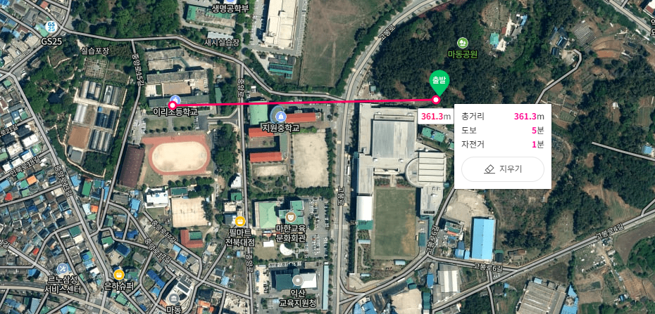마동 자이에서 제일 가까운 초등하교는 이리초등학교 입니다. 지도상 직선 거리로 약 360m 이며, 단지 조성에 따라 거리는 달라 질 수 있습니다. 저학년 초등학생 자녀가 통학 하기엔 무리가 없어 보입니다.