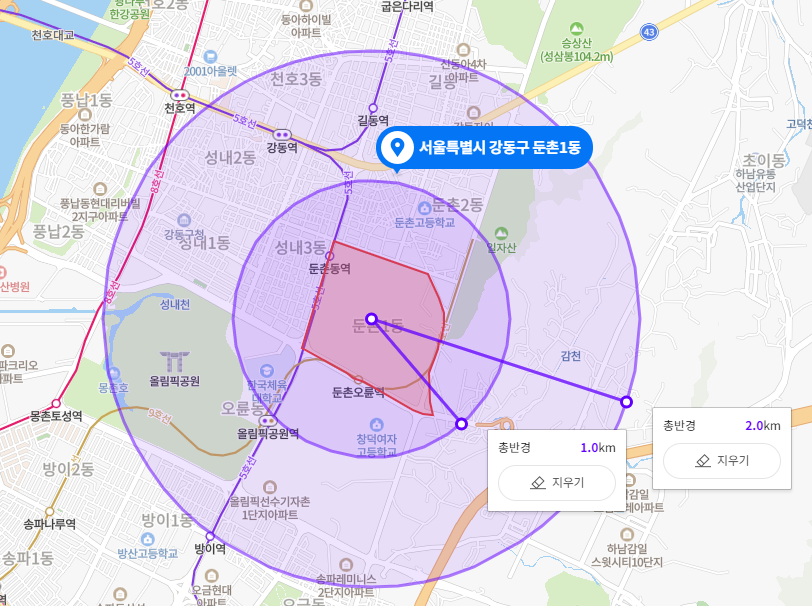 1~2km 반경내에 올림픽공원, 일자산까지 위치하며, 5호선역과 9호선역이 가까이에 위치해 더블 역세권을 만족하고 있습니다.