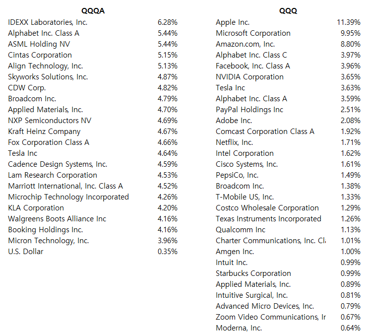 QQQ와 종목을 비교해 보면 QQQ 상위 종목인 애플, 마이크로소프트, 아마존등과 같은 기업들은 제외 되어 있습니다.
