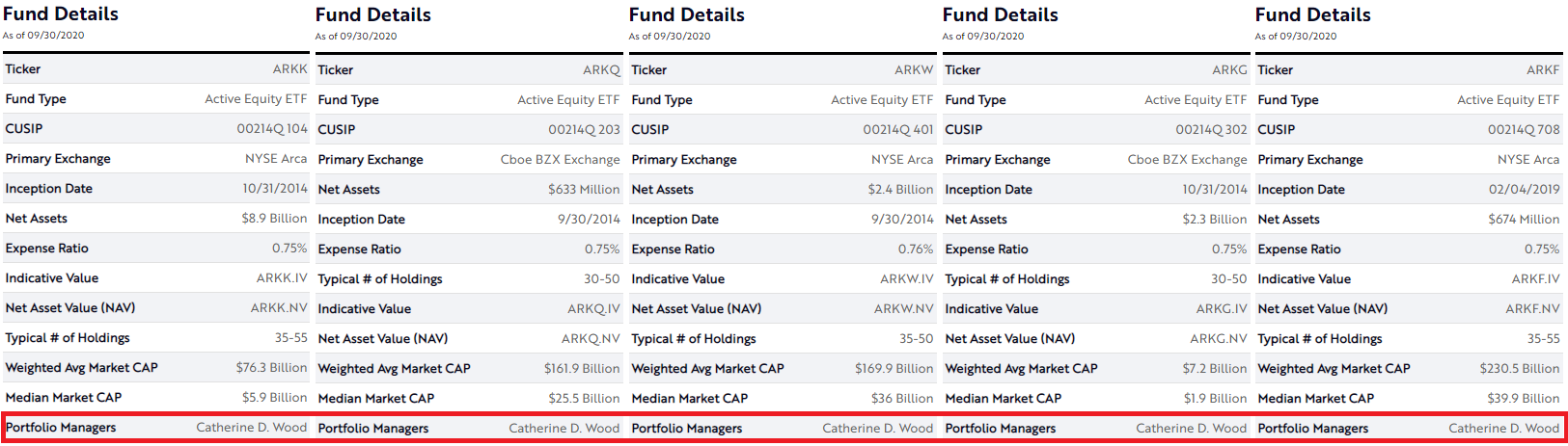ARKK, ARKQ, ARKW, ARKG, ARKF 의 포트폴리오 매니저가 모두 캐서린 우드(캐시 우드)로 되어 있습니다.