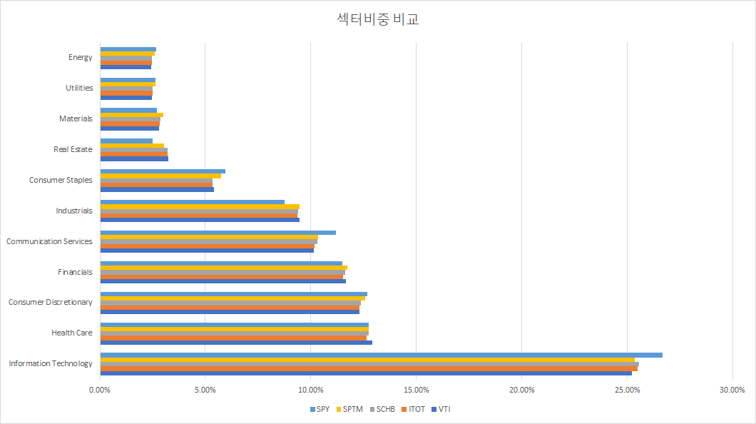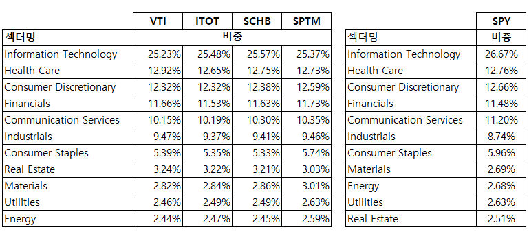 VTI, ITOT, SCHB, SPTM 은 섹터 비중이 거의 동일합니다.