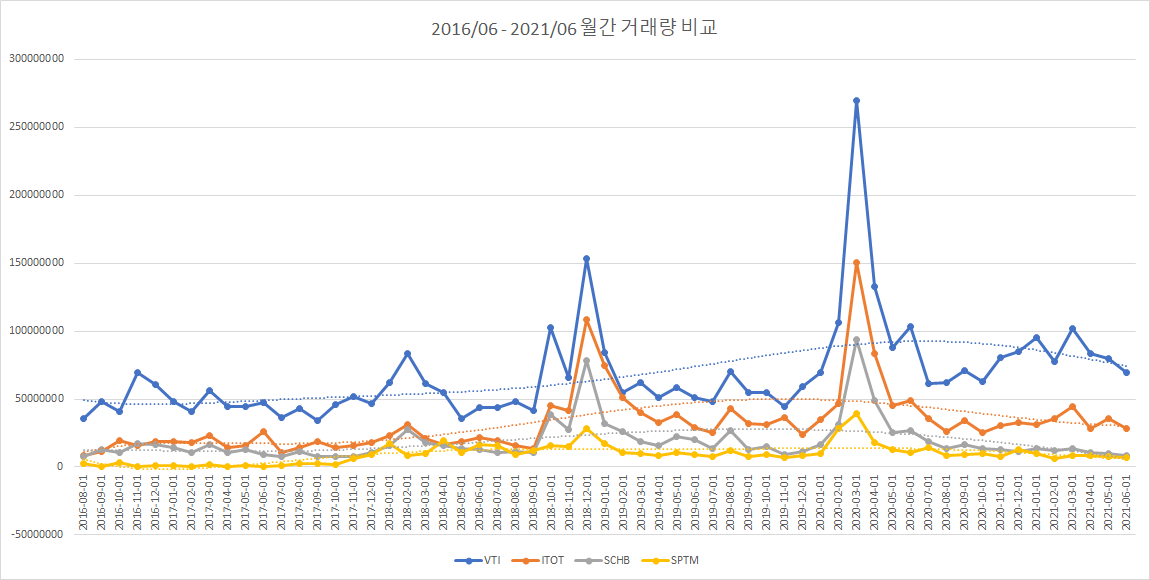 약 5년간의 월간 거래량 변화를 보면 VTI는 증가추세, ITOT도 어느정도 증가세 이지만, SCHB, SPTM은 큰 변동은 보이지 않습니다.