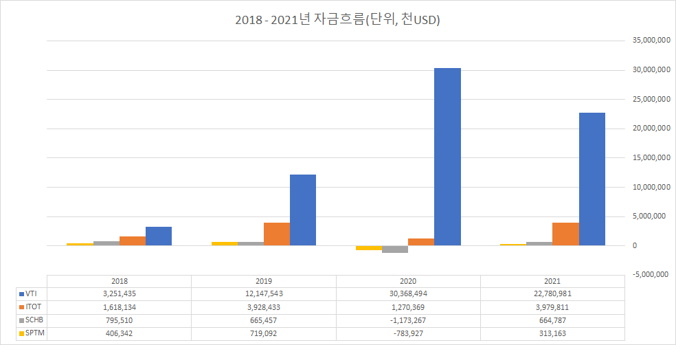 하지만, 자금 흐름을 보면 다른 결과를 보여 줍니다. 2020년 코로나 하락시 VTI와 ITOT는 자금이 유입 되었으나 SCHB와 SPTM은 오히려 자금이 빠져 나갔습니다.