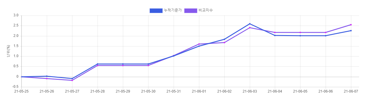 보라색이 비교지수인 코스피지수 수익률 입니다. 거의 근소하게 앞서거나 따라가는 모습을 보여 주고 있습니다.