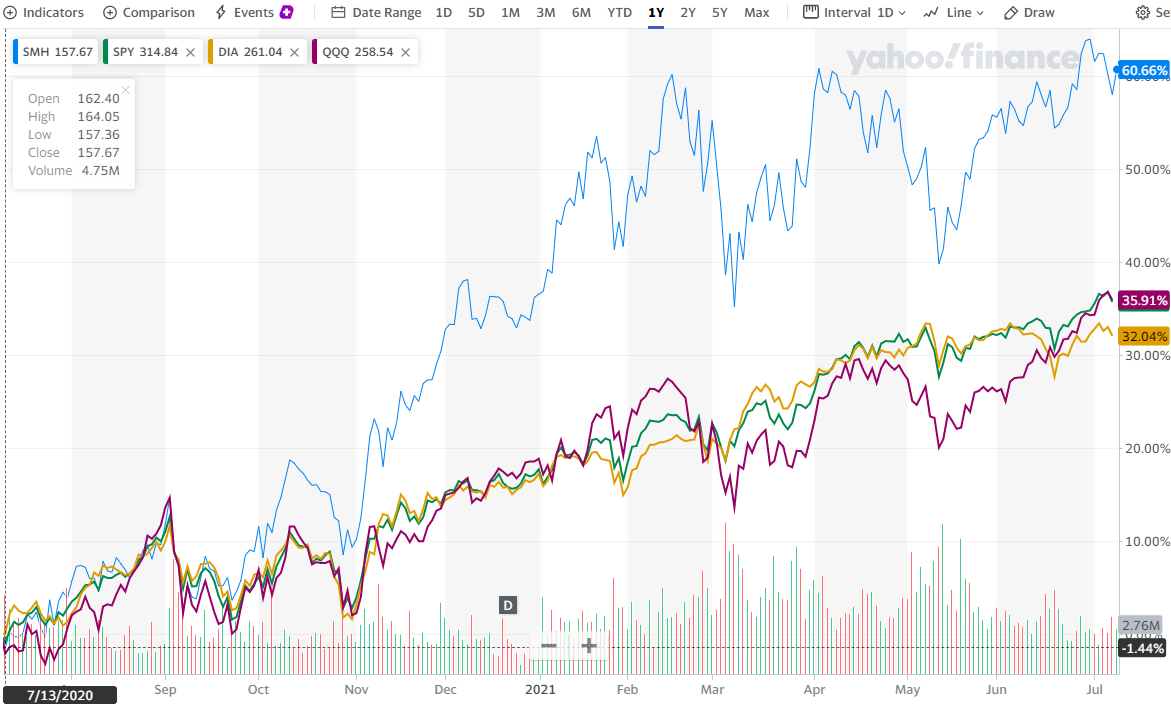 2020년 7월 13일 부터 검토일 까지 약 60% 상승을 보였습니다. 3대 지수 ETF인 SPY, DIA, QQQ는 동일 기간 약 30~35%정도의 수익을 보였지만 최근 SMH는 고점에서 등락폭이 큰 편이었습니다.