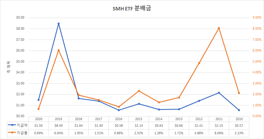 SMH ETF 는 1년에 한번 12월에 분배금을 지급합니다.