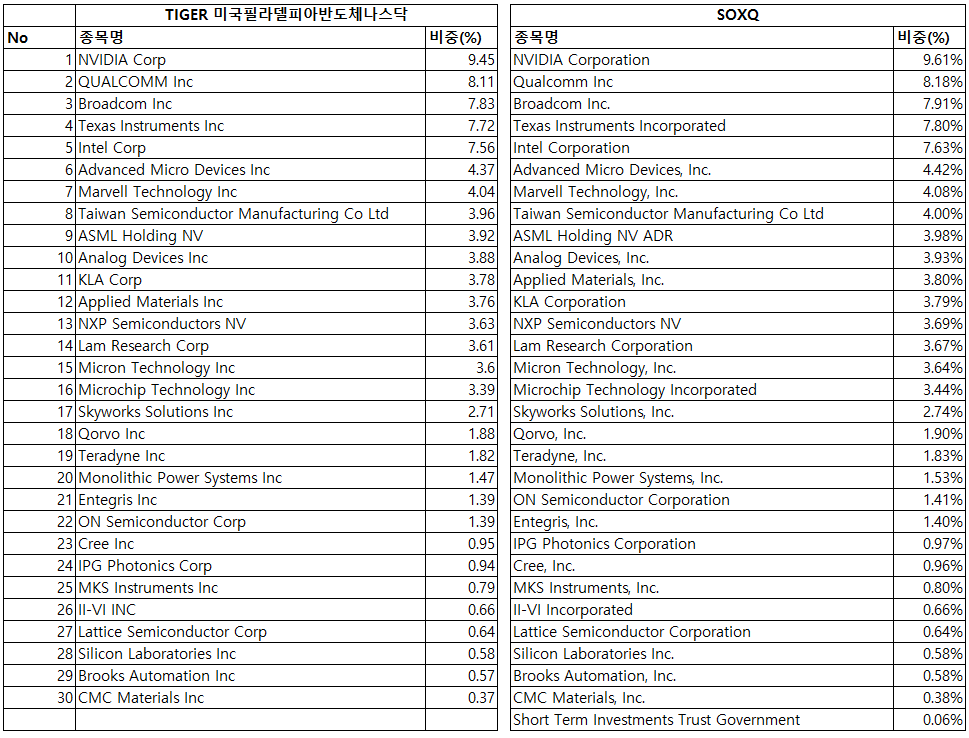 같은 지수를 사용하는 SOXQ와 TIGER 미국필라델피아반도체나스닥은 종목 구성이 거의 같고 비중도 같습니다.