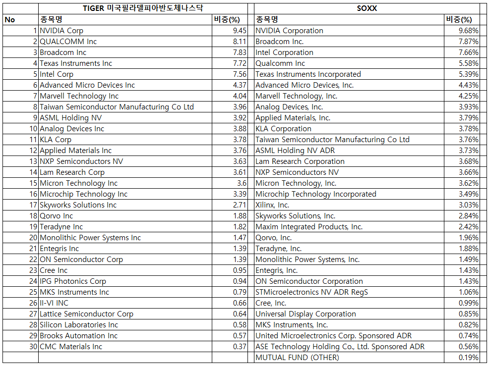 SOXX는 지수 변경으로 인해 종목이 다소 상이한 편입니다.