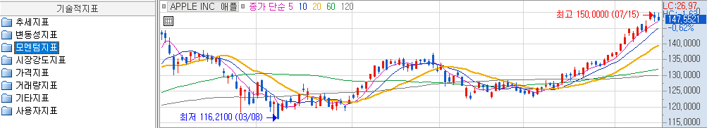 차트의 기술적 지표를 보면 다양한 모멘텀지표가 있습니다.
