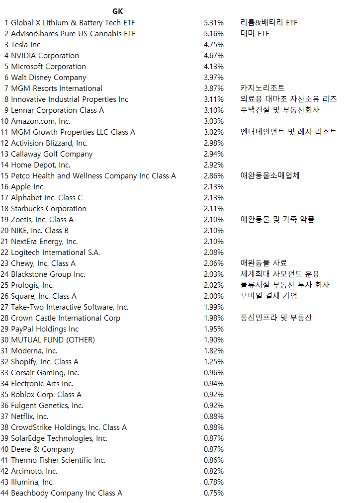 상위 종목으로 리튬과 배터리에 투자하는 LIT ETF가 포함되어 있으며, 자사의 대마 ETF도 포함되어 있습니다. 그외에 카지노, 애완동물, 게임, 부동산등의 종목들이 포함되어 있습니다.