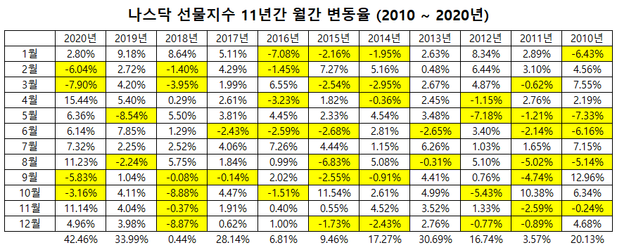 2010년 ~ 2020년 나스닥 선물지수 월간 변동율