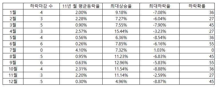 11년 동안 월별 하락 월수를 보면 6월 9월이 많은 편이긴 합니다.