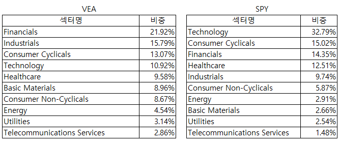 같은 대형 혼합성향을 가진 SPY, S&P 500 지수도 기술섹터의 비중이 높습니다.