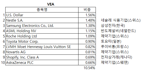 VEA는 ETF는 미국을 제외한 선진국에 투자를 ETF 입니다. 비중 상위 국가로는 일본이 위치해 있으며, 한국도 포함되어 있습니다.