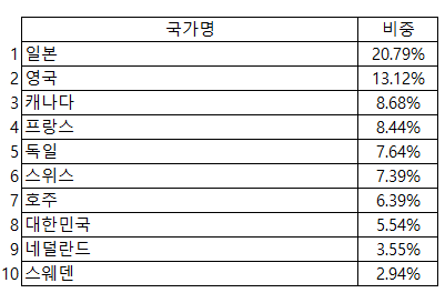 일본이 높은 비중으로 포함되어 있으며, 한국은 8번째 비중을 차지하고 있습니다.