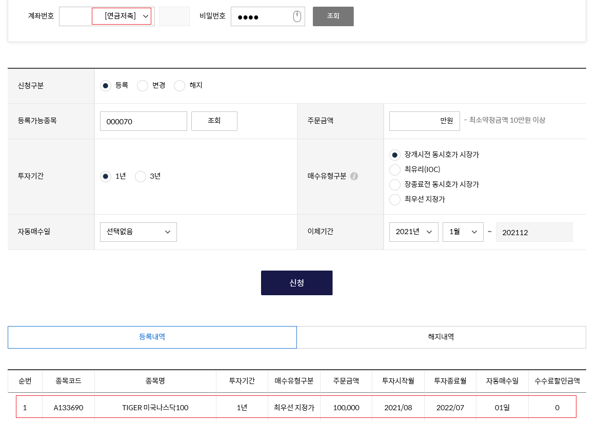 투자대상란의 대상종목 조회를 통해 적립식 매수할 종목이 목록에 있는지 확인 가능합니다.