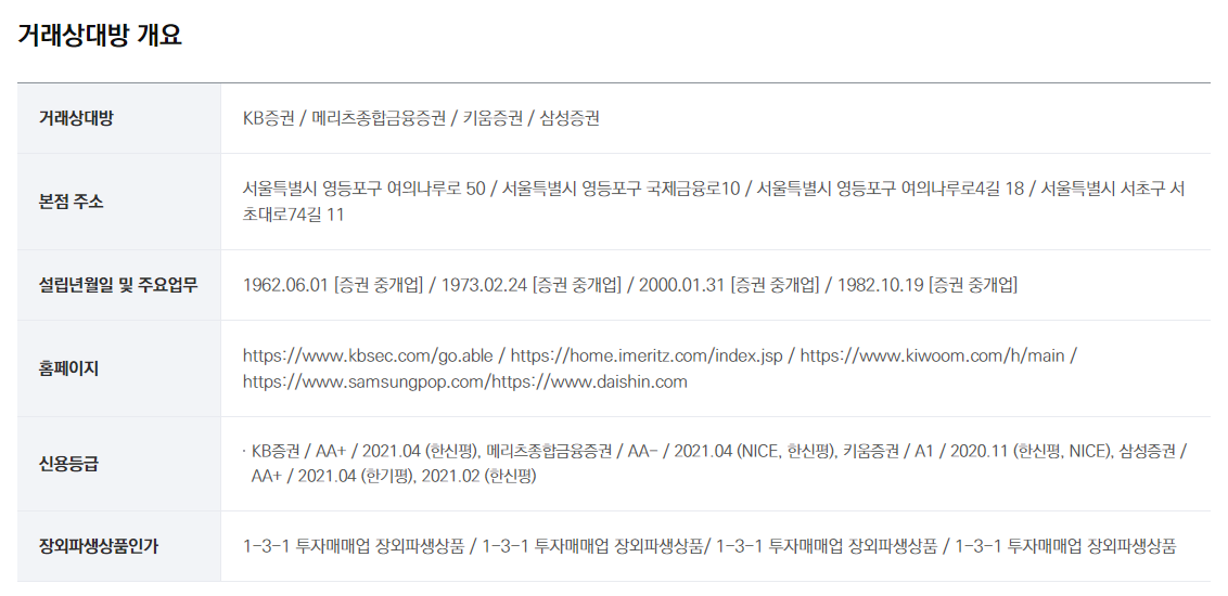 합성상품임으로 계약을 체결한 증권사 정보를 공개하고 있습니다. 거래 상대방으로 KB증권, 메리츠, 키움, 삼성증권이 대상입니다.