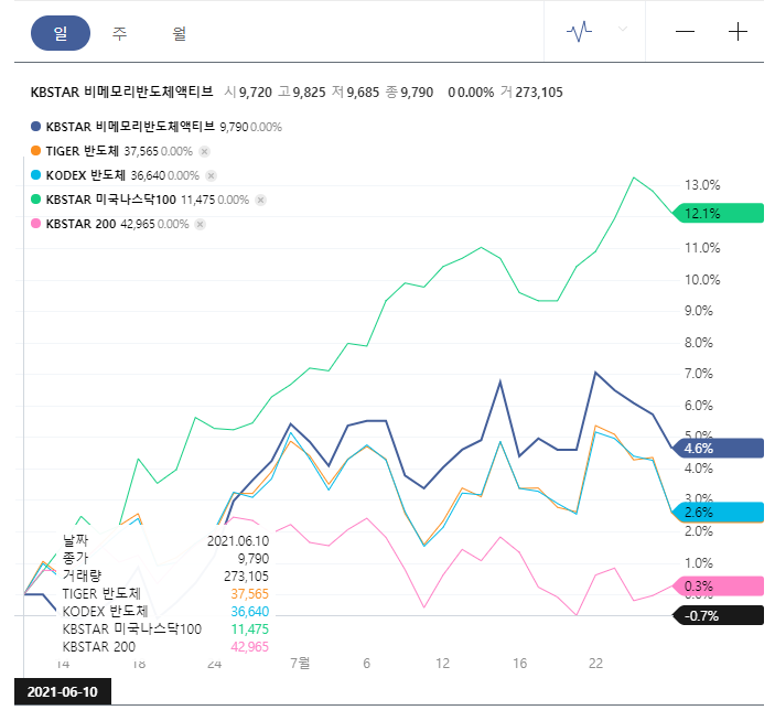 KBSTAR 비메모리반도체액티브의 상장일은 21년 6월 10일 부터의 주가 수익률을 보면 KBSTAR 비메모리반도체액티브가 TIGER 반도체나, KODEX 반도체보다 수익률이 좋았습니다.