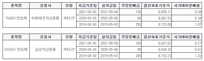 3년간 분배금 지급내역 입니다. 타이거 반도체, 코덱스 반도체 모두 분배금을 지급했습니다.