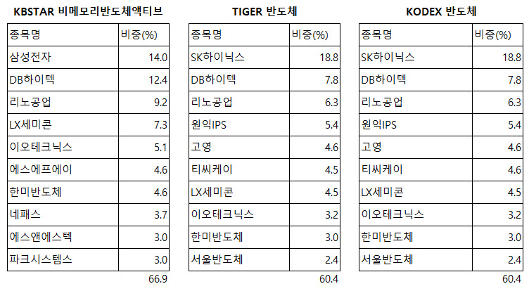 TIGER 반도체, KODEX 반도체 모두 대형주인 SK하이닉스 비중이 높고 KBSTAR 비메모리반도체액티브역시 삼성전자의 비중이 높아 SK하이닉스와 삼성전자를 3가지 상품이 치환했다고 보면 될 것 같습니다.