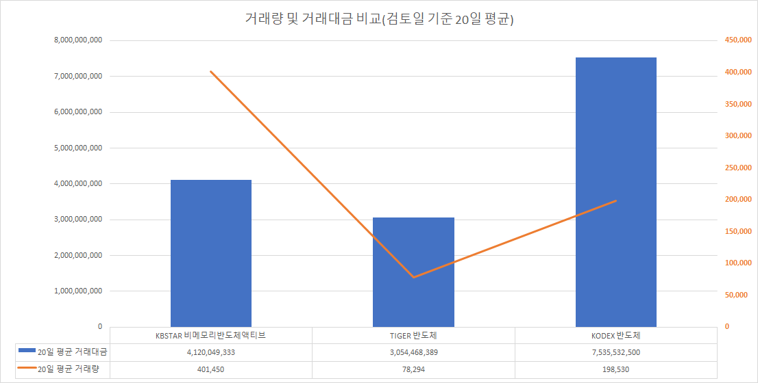거래대금을 보면 KODEX 반도체의 거래대금이 높은 편입니다. KBSTAR 비메모리반도체액티브의 거래량이 40만건 인데 반해 주가가 낮기 때문입니다.