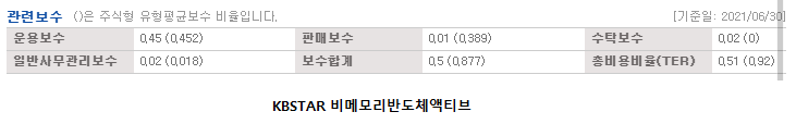 21년 06월 30일 공시를 보면 KBSTAR 비메모리반도체액티브의 총비율이율이 0.51입니다. 0.01의 기타보수가 책정되어 있습니다.