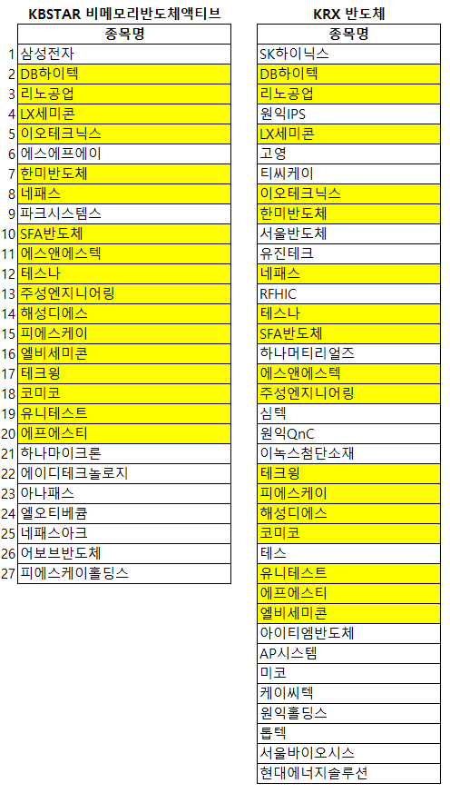 KBSTAR 비메모리반도체액티브 전체 27개 종목 중 17개 종목이면 약 60% 가까운 중복을 보이고 있습니다.