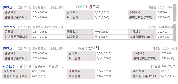 KODEX 반도체와 TIGER 반도체의 2020년 11월 30일에 공시된 운영보수와 2021년 06월 30일 공시된 운영보수 비교입니다. TIGER(타이거) 반도체는 변경이 없으며, KODEX(코덱스) 반도체는 작년에 봤던 내용보단 조금 할인이 되었습니다.