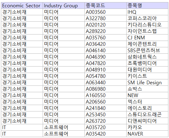 카카오, 네이버가 IT로 분류되며, 나머지 종목들은 모두 경기소비재입니다.