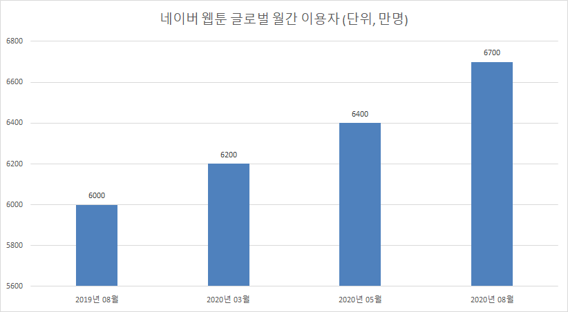 네이버 웹툰의 월간 이용자 추이를 보면 빠른 증가세를 보이고 있습니다. KT 경제경영연구소에 따르면 국내 웹툰 시장은 2013년 1,500억원 규모에서 2020년 1조원 규모로 성장했다고 하며, 운영사는 해당 사업이 앞으로도 다양한 IP를 통해 커나갈 걸 기대하고 있습니다.