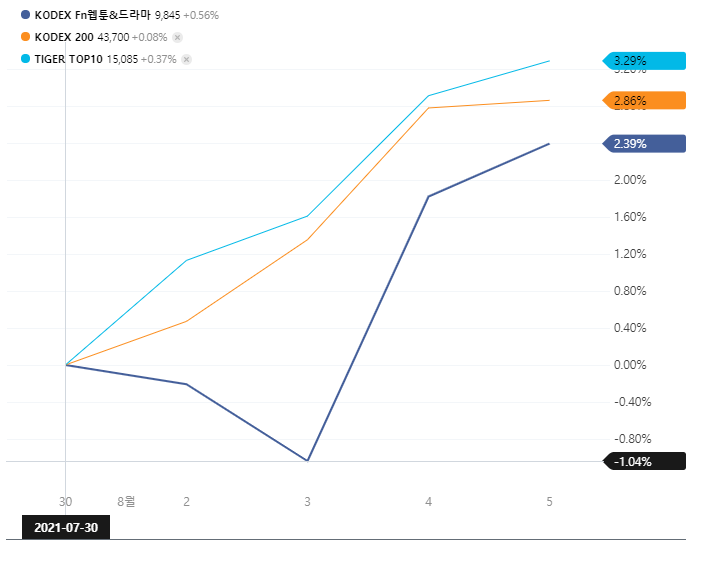 상장일부터의 수익률을 보면 KODEX Fn 웹툰&드라마 ETF가 코덱스 200이나 타이거 탑 텐보다 다소 낮은 수익률을 보여주지만, 아직 상장된지 얼마 안되어 지켜볼 필요가 있습니다.