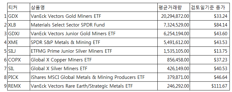 Materials로 분류된 ETF 중 평균거래량 순위는 검토일 기준 9위이며, 1위는 금관련 ETF 입니다.