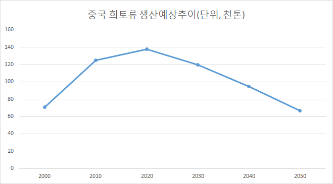 중국은 그만큼 소비도 많이 하고 있어 중국의 희토류관련 생산예상 추이는 하락하리라 기관들은 예상하고 있으며, 검토일 기준 미국과의 마찰도 있기 때문에 다소 불안한 건 사실입니다.