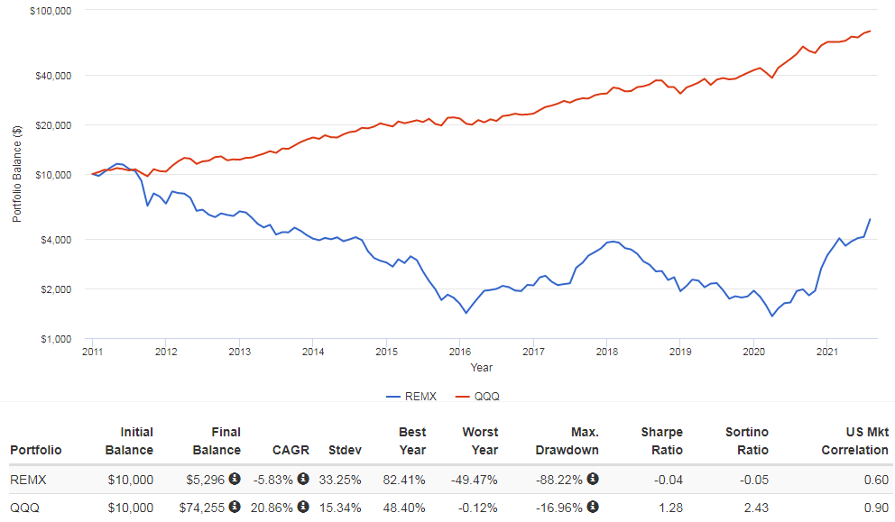 2010 ~ 검토일 까지의 연평균 성장률은 QQQ는 약 20%인 반면 REMX는 약 -5%입니다. 가장 나쁜해의 수익율은 -49%로 QQQ의 -0.12% 대비 매우 큰편이며, MDD는 -88%로 QQQ -16%의 5배가 넘는 하락을 보였습니다.