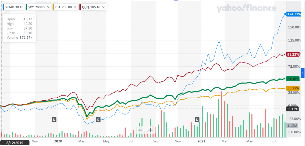| REMX | 27.99 | 36.25 | 65.21 | 173.78 | 23.67 | 20.54 | -6.55 |