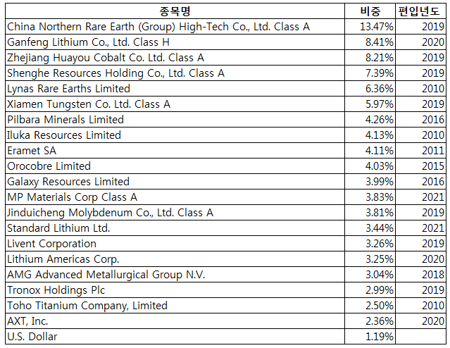 | 지수명 | MVIS Global Rare Earth/Strategic Metals Index |
