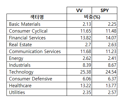 산업섹터 비중을 봐도 VV ETF는 S&P 500과 큰 차이가 없습니다.