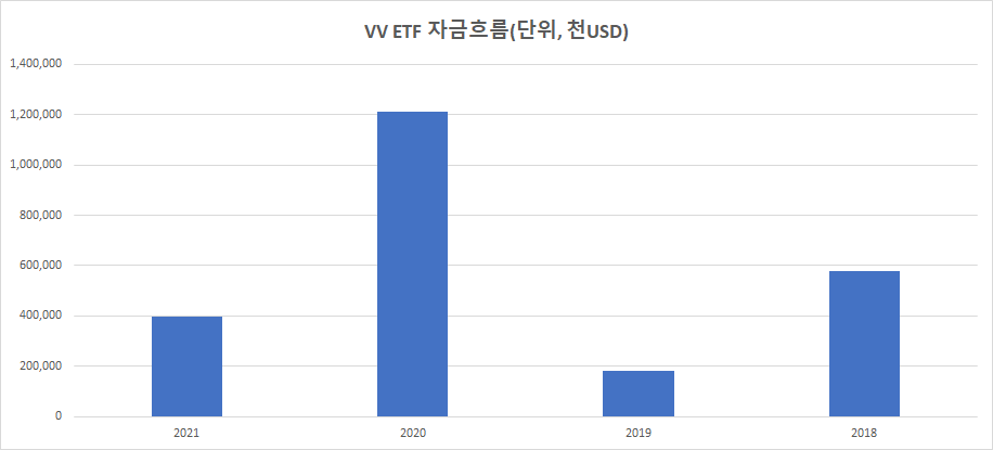 VV ETF의 자금 흐름을 보면 2020년 코로나때 많은 자금이 유입 되었습니다. 어려울 때일 수 록 대기업에 많은 투자가 이루어 진 걸 알 수 있습니다.