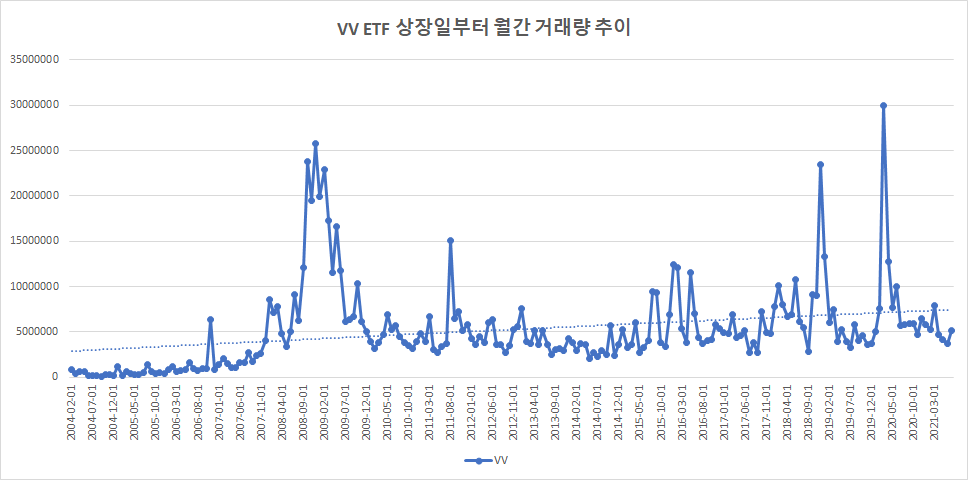 거래량이 다소 적은 게 흠이지만, 거래량은 증가추세에 있으며 상장된지 10년 이상된 상품이라 앞으로도 잘 유지되리라 생각됩니다. 또한, 운용사인 뱅가드는 상품의 상장폐지율이 아주 낮은 운용사이며, 미국의 3대 운용사로 운용자금대비 발행 상품수도 아주 적은 운용사입니다.