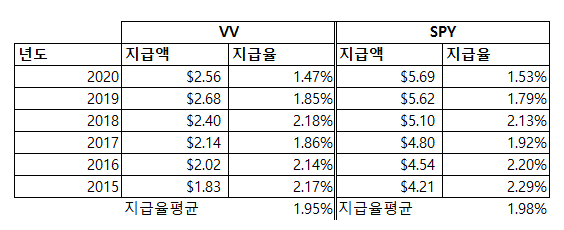 분배금의 지급율 평균은 SPY가 조금 더 앞서지만 큰 차이는 아닙니다.