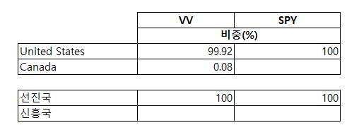VV ETF나 S&P 500 ETF 모두 미국이 대부분 차지하며, 선진국 비율도 100% 입니다.