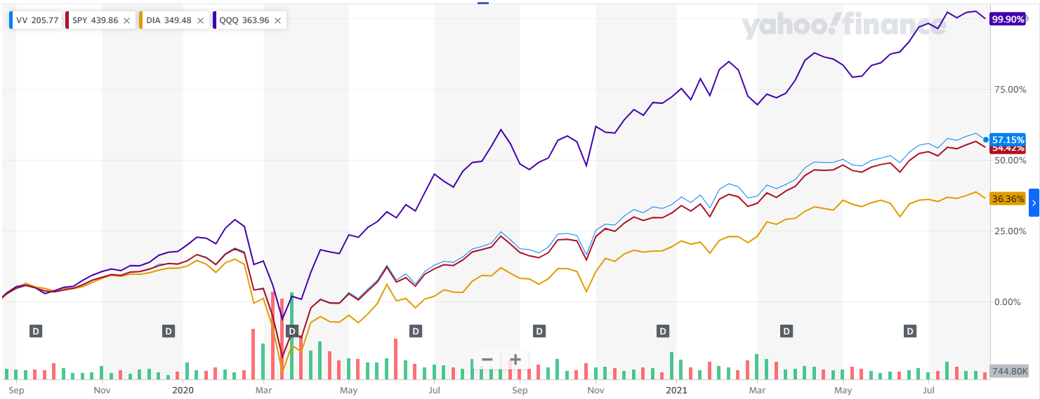 QQQ가 SPY, DIA, VV보다 좋은 수익을 보이며, VV는 SPY 보다 조금 높은 수익을 보이고 있습니다.