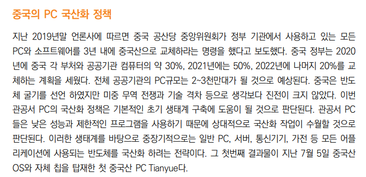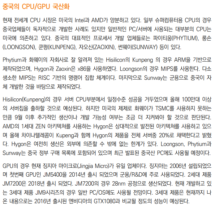 하지만, 중국은 자국내 PC나 OS를 모두 중국산으로 교체하고 있으며, CPU와 GPU도 국산화를 하고 있습니다.