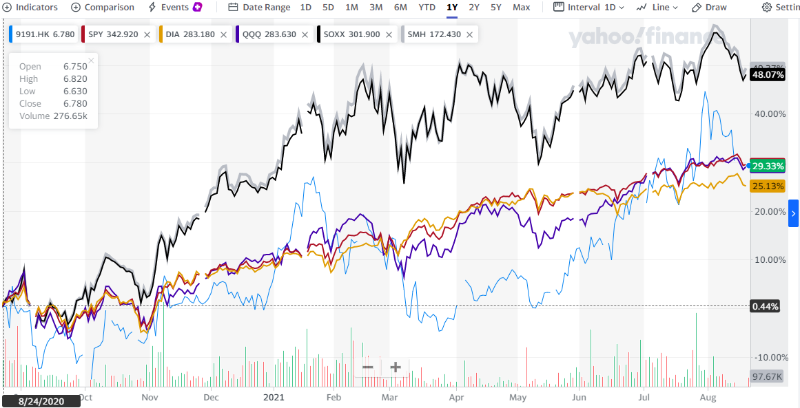 2020년 8월 24일 부터의 주가 그래프입니다. 최근 미국 3대 지수 ETF들보도 좋은 수익률을 보였으며, SOXX나 SMH보다 낮은 수익률을 보였습니다.